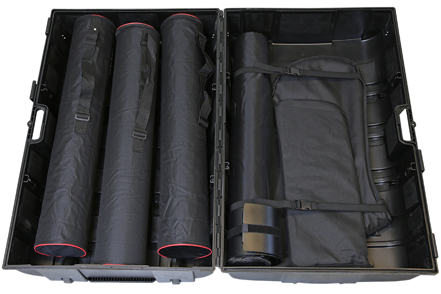 Die expo-case Theke bietet viel Stauraum. Sogar für einige Bannersysteme ist Platz. Eine hervorragende Transportlösung, ausgestattet mit stabilen Rollen.