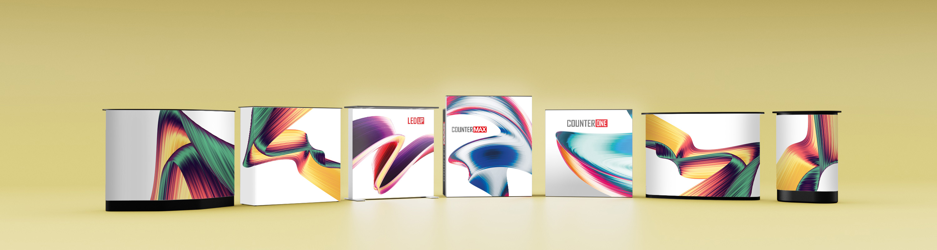 Das umlaufende Grafikpanel wird mit einem Klettverschluss befestigt. Mit der optionalen klappbaren Tischplatte haben Sie eine große Arbeitsfläche von 76x48 cm , um Ihre Produktivität bei der nächsten Veranstaltung oder Messe zu steigern.