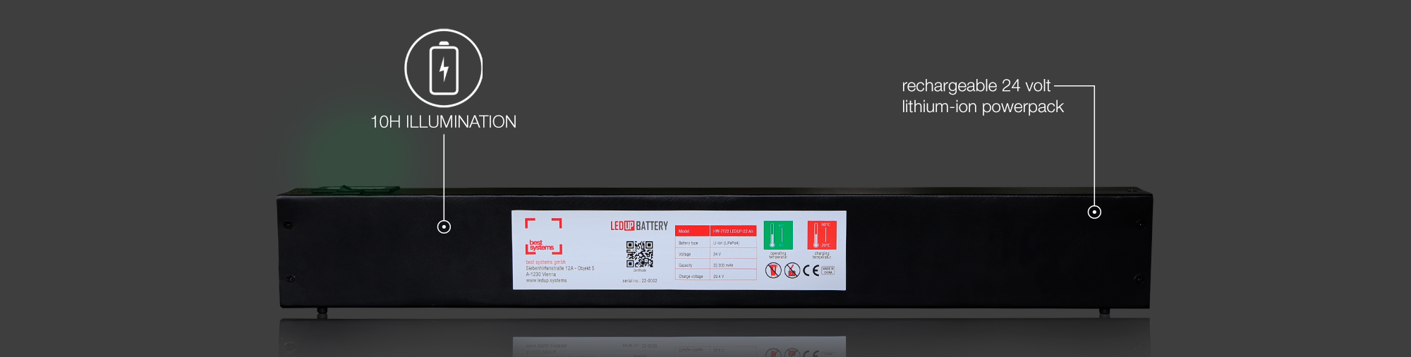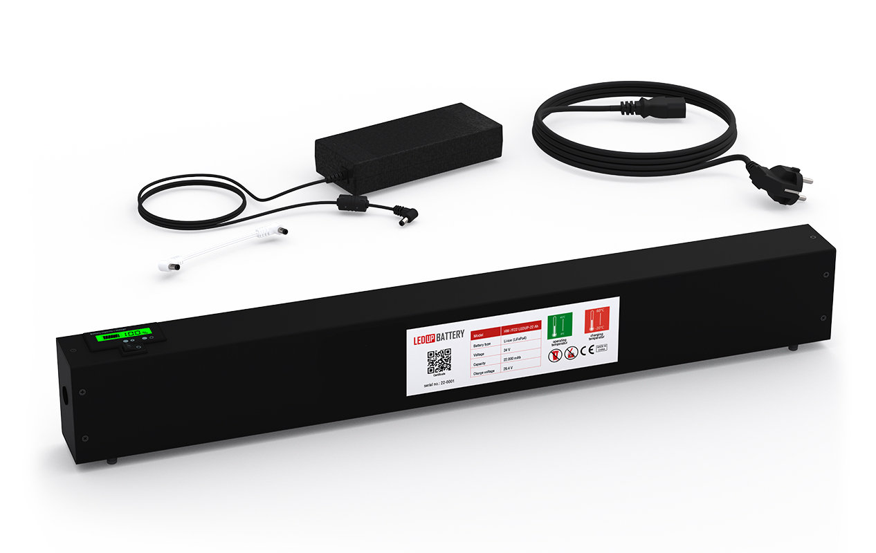 Das wiederaufladbare 24-Volt-Lithium-Ionen-Powerpack hat ein Gewicht von 5 kg mit einer Kapazität von 22.000 mAh und kann den LEDUP® Battery über 10 Stunden beleuchten. So haben Sie die Möglichkeit, den LEDUP® Battery für einen ganzen Tag auf einer Messe zu beleuchten. Wenn Sie die Möglichkeit haben, eine Stromquelle in der Nähe des Leuchtrahmens zu finden, können Sie den Rahmen mit wenigen Handgriffen direkt über die Stromversorgung betreiben.