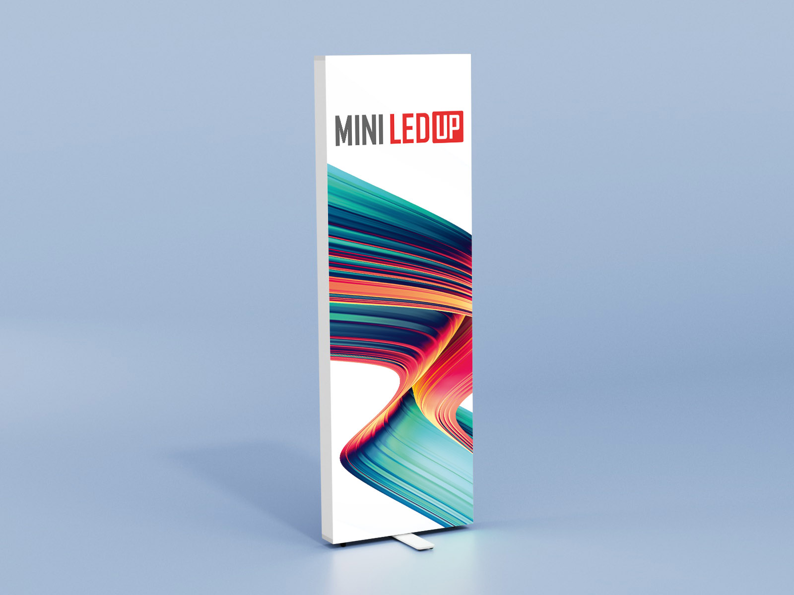Ein hoher Helligkeitsgrad mit gleichmäßiger Ausleuchtung, silber eloxierte Aluminiumprofile mit einer Tiefe von nur 80 mm und der einfache, werkzeuglose Aufbau dank des innovativen Stecksystems machen den MINI LEDUP® zu einem Champion unter den Leuchtdisplays.