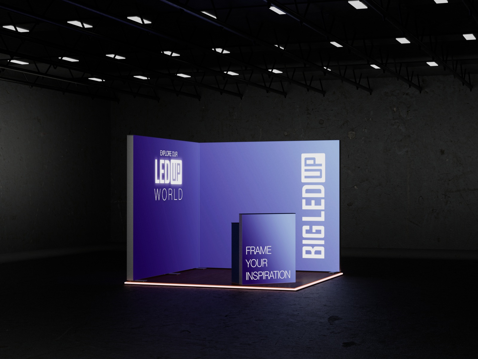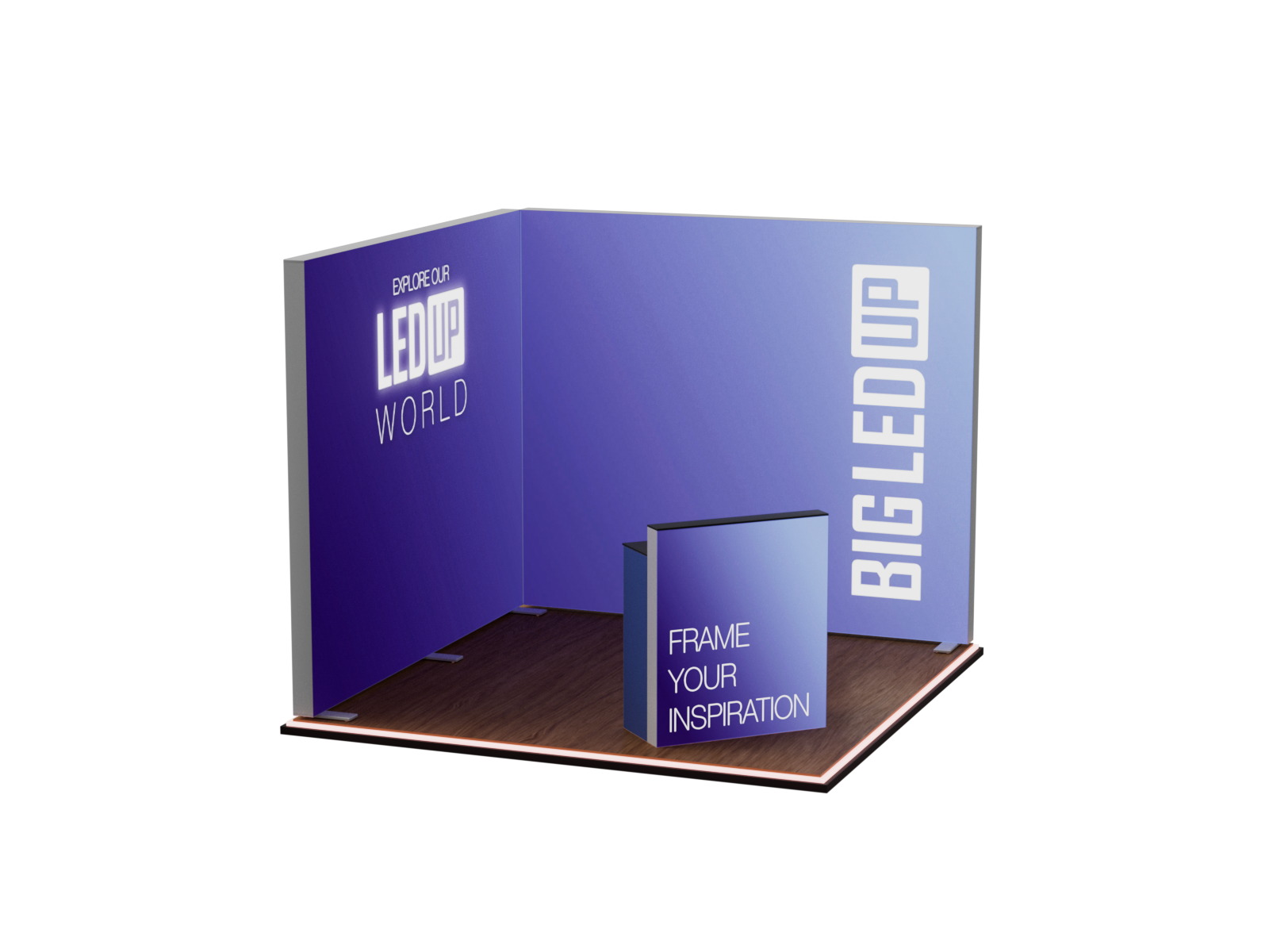 Dieses Set ist mit einer Grundfläche von 3x3 m und einer Höhe von 248 cm, sowie einem Counter MAX, eine kompakte Lösung für eine wirkungsvolle Präsentation.