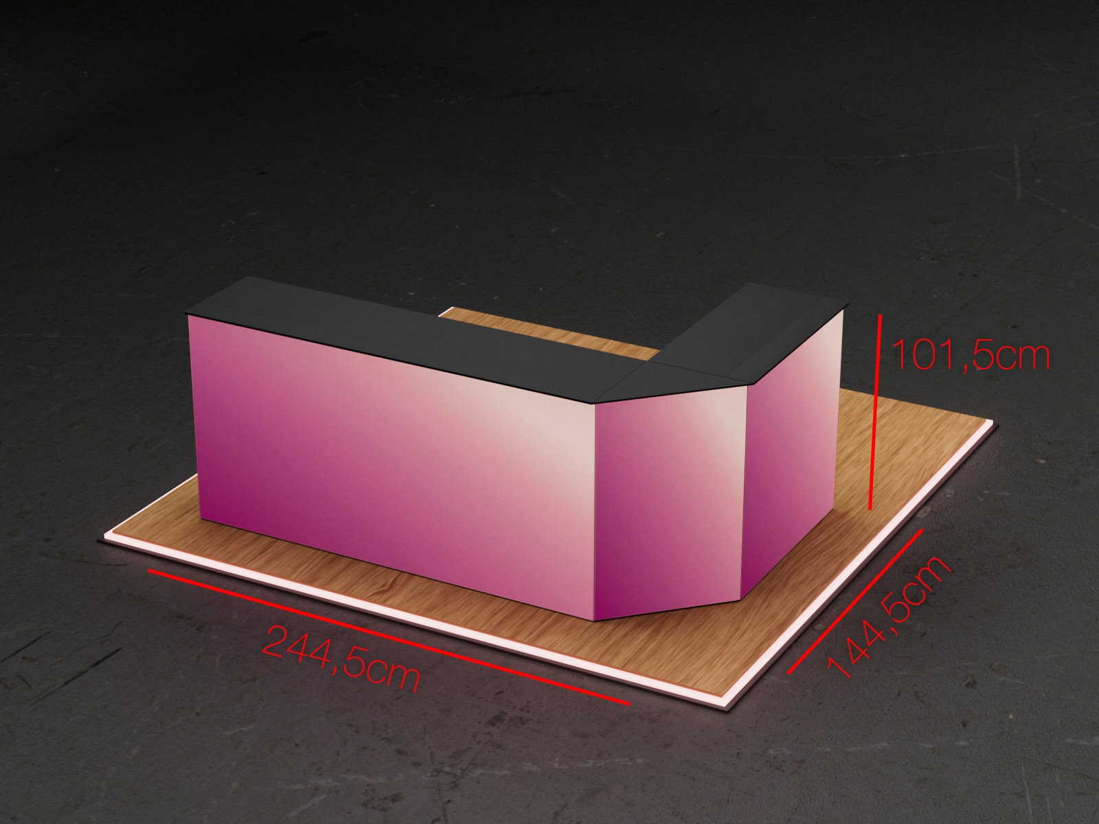 Das COUNTER LORENA Set kombiniert drei beleuchtete COUNTER ONE Module, ein Extension Set sowie ein 90° Eckmodul zu einer eleganten, L-förmigen Counterlösung. Ideal für Eckstände, Welcome-Desks oder kompakte Präsentationsflächen, bei denen Sichtbarkeit aus zwei Richtungen gefragt ist.